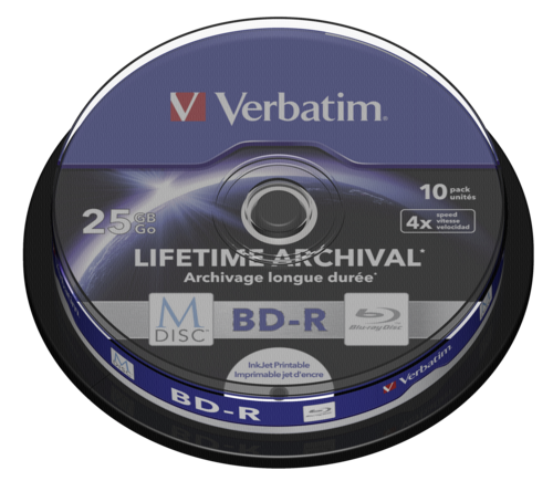 "M-DISC Verbatim BD-R 25GB 4x Inkjet Printable Spindle" von Verbatim aus der Kategorie TV&Video Zubehör wird geliefert mit 10 Stück(e) pro Packung und vom Typ BD-R.