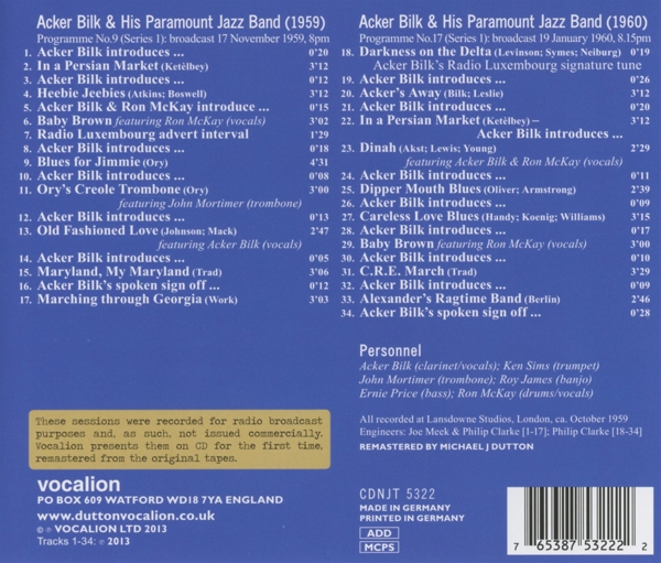 01. Bilk, Acker & His Paramount Jazz Band "Acker Bilk introduces..." 02. Bilk, Acker & His Paramount Jazz Band "In a Persian market" 03. Bilk, Acker & His Paramount Jazz Band "Acker Bilk introduces..." 04. Bilk, Acker & His Paramount Jazz Band "Heebie Jeebies" 05. Bilk, Acker & His Paramount Jazz Band "Acker Bilk & Ron McKay introduce..." 06. Bilk, Acker & His Paramount Jazz Band "Baby brown" 07. Bilk, Acker & His Paramount Jazz Band "Radio Luxembourg advert interval" 08. Bilk, Acker & His Paramount Jazz Band "Acker Bilk introduces..." 09. Bilk, Acker & His Paramount Jazz Band "Blues for Jimmie" 10. Bilk, Acker & His Paramount Jazz Band "Acker Bilk introduces..." 11. Bilk, Acker & His Paramount Jazz Band "Ory's Creole trombone" 12. Bilk, Acker & His Paramount Jazz Band "Acker Bilk introduces..." 13. Bilk, Acker & His Paramount Jazz Band "Old fashioned love" 14. Bilk, Acker & His Paramount Jazz Band "Acker Bilk introduces..." 15. Bilk, Acker & His Paramount Jazz Band "Maryland, my Maryland" 16. Bilk, Acker & His Paramount Jazz Band "Acker Bilk's spoken sign off..." 17. Bilk, Acker & His Paramount Jazz Band "Marching through Georgia" 18. Bilk, Acker & His Paramount Jazz Band "Darkness on the delta (Acker Bilk's Radio Luxembourg signature tune)" 19. Bilk, Acker & His Paramount Jazz Band "Acker Bilk introduces..." 20. Bilk, Acker & His Paramount Jazz Band "Acker's away" 21. Bilk, Acker & His Paramount Jazz Band "Acker Bilk introduces..." 22. Bilk, Acker & His Paramount Jazz Band "In a Persian market / Acker Bilk introduces..." 23. Bilk, Acker & His Paramount Jazz Band "Dinah" 24. Bilk, Acker & His Paramount Jazz Band "Acker Bilk introduces..." 25. Bilk, Acker & His Paramount Jazz Band "Dippermouth Blues" 26. Bilk, Acker & His Paramount Jazz Band "Acker Bilk introduces..." 27. Bilk, Acker & His Paramount Jazz Band "Careless love" 28. Bilk, Acker & His Paramount Jazz Band "Acker Bilk introduces..." 29. Bilk, Acker & His Paramount Jazz Band / McKay, Ron "Baby brown" 30. Bilk, Acker & His Paramount Jazz Band "Acker Bilk introduces..." 31. Bilk, Acker & His Paramount Jazz Band "C.R.E. March" 32. Bilk, Acker & His Paramount Jazz Band "Acker Bilk introduces..." 33. Bilk, Acker & His Paramount Jazz Band "Alexander's ragtime band" 34. Bilk, Acker & His Paramount Jazz Band "Acker Bilk's spoken sign off..."