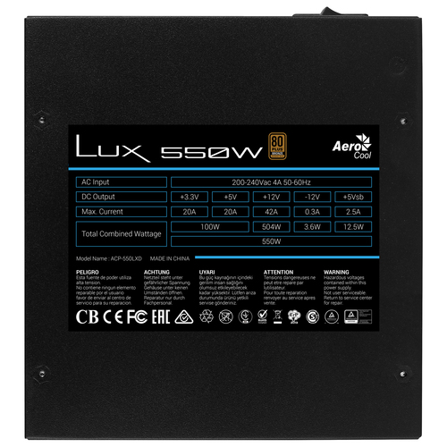 | ARTIKEL | LUX 550W Netzteil 20+4 pin ATX ATX Schwarz (AEROLUX-550-80BRONZE) | | | | |