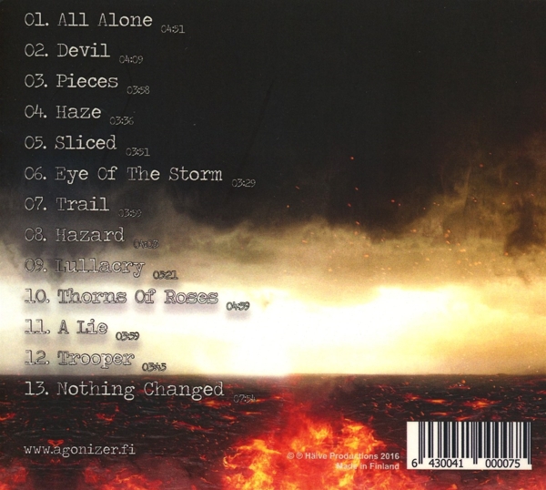 01. "All alone" 02. "Devil" 03. "Pieces" 04. "Haze" 05. "Sliced" 06. "Eye of the storm" 07. "Trail" 08. "Hazard" 09. "Lullacry" 10. "Thorns of roses" 11. "A lie" 12. "Trooper" 13. "Nothing changed"