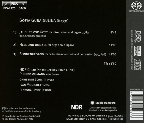Beschreibung:Composed By: Sofia Gubaidulina, Cover: Giovanni Di Paolo Di Grazia, Design: Andrew Barnett, Engineer: Dominik Blech, Engineer: Martin Lohmann, Executive Producer: Marita Prohmann, Executive Producer: Robert Suff, Liner Notes: Helmut Peters (3), Liner Notes [Translated By]: Andrew Barnett, Liner Notes [Translated By]: Jean-Pascal Vachon, Mixed By: Dirk Lüdemann, Mixed By: Thorsten Weigelt, Photography: Michael Müller (11), Producer: Dirk Lüdemann, Producer: Thorsten Weigelt, Text By: Helmut Peters (3), Alto Vocals: Andrea Hess (2), Alto Vocals: Ina Jaks, Bass Vocals: Andreas Pruys, Bass Vocals: Dávid Csizmár, Choir: NDR Chor, Conductor: Philipp Ahmann, Organ: Christian Schmitt (2), Soprano Vocals: Akiko Ito (5), Soprano Vocals: Rebecca Lea (2), Tenor Vocals: Joachim Duske, Tenor Vocals: Johannes Gaubitz, Organ: Christian Schmitt (2), Alto Vocals: Gesine Grube, Bass Vocals: Andreas Pruys, Celesta: Werner Hans Hagen, Cello: Ivan Monighetti, Ensemble: Elbtonal Percussion, Percussion: Andrej Kauffmann, Percussion: Stephan Krause, Percussion: Sönke Schreiber, Soprano Vocals: Katharina Sabrowski, Tenor Vocals: Johannes Gaubitz, Labelcode BIS2276SACD (BIS-2276 SACD), Recorded At Rolf Liebermann Studio, Recorded At Hauptkirche St. Nikolai, Hamburg, Recorded At St. Johannis, Hamburg-Altona