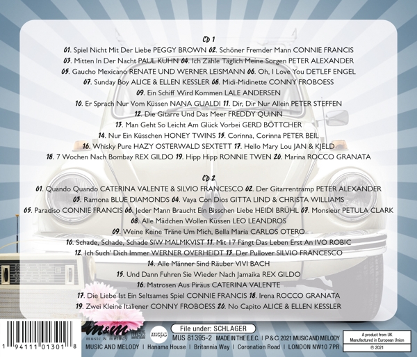 Disc 02 01. Caterina Valente & Silvio Fran "Quando Quando" 02. Alexander, Peter "Der Gitarrentramp" 03. Blue Diamonds "Ramona" 04. Gitta Lind & Christa Williams "Vaya Con Dios" 05. Francis, Connie "Paradiso" 06. Brühl, Heidi "Jeder Mann Braucht Ein Bisschen Liebe" 07. Clark, Petula "Monsieur" 08. Leandros, Leo "Alle M?dchen Wollen Küssen" 09. Otero, Carlos "Weine Keine Tr?ne Um Mich, Bella Maria" 10. Malmkvist, Siw "Schade, Schade, Schade" 11. Robic, Ivo "Mit 17 F?ngt Das Leben Erst An" 12. Overheidt, Werner "Ich Such Dich Immer" 13. Francesco, Silvio "Der Pullover" 14. Bach, VIVI "Alle M?nner Sind R?uber" 15. Gildo, Rex "Und Dann Fuhren Sie Wieder Nach Jamaika" 16. Valente, Caterina "Matrosen Aus Pir?us" 17. Francis, Connie "Die Liebe Ist Ein Seltsames Spiel" 18. Granata, Rocco "Irena" 19. Froboess, Conny "Zwei Kleine Italiener" 20. Kessler, Alice & Ellen "No Capito"
