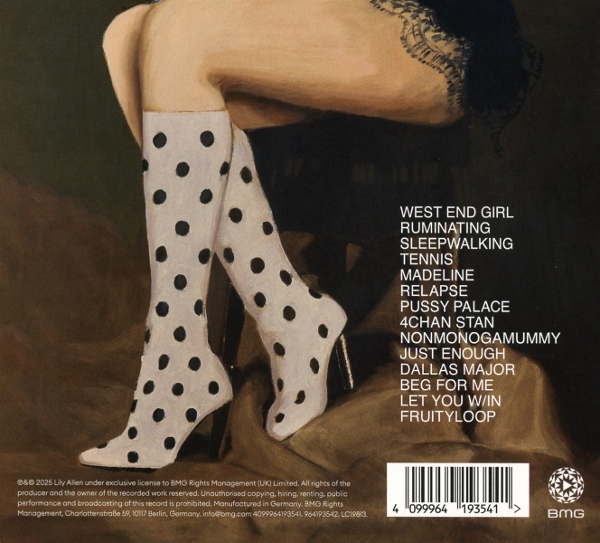 Veröffentlicht wird "West End Girl" von BMG Rights Mgmt GmbH, einem Unternehmen innerhalb der modernen BMG-Gruppe, das sich auf das Management von Musikrechten spezialisiert hat. BMG Rights Mgmt GmbH steht für einen serviceorientierten Ansatz mit Fokus auf faire, transparente Zusammenarbeit mit Künstlern und Autoren. Das Unternehmen vereint traditionelle Branchenerfahrung mit datengetriebenen Strukturen und einem internationalen Netzwerk und sorgt so für professionelle Vermarktung, weltweiten Vertrieb sowie sorgfältige Abwicklung von Lizenz-, Verlags- und Leistungsschutzrechten - auch für Veröffentlichungen von Künstlerinnen wie Lily Allen. |  | | Anzahl der Titel: |