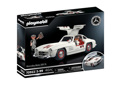 Die Sportwagen-Ikone aus den 1950er Jahren mit den legendären Flügeltüren. Jetzt auch von PLAYMOBIL, ausgestattet mit Figuren und Accessoires in einer Rennsport-Szenerie der 1950er Jahre. Der Mercedes-Benz 300 SL von PLAYMOBIL, der Sportwagenklassiker mit den legendären Flügeltüren, fährt vor. Bei seiner Präsentation auf der International Motor Sports Show in New York im Jahr 1954 galt der Mercedes-Benz 300 SL als schnellster Sportwagen seiner Zeit, denn er erreichte Spitzengeschwindigkeiten von bis zu 260 km/h. Mit seinen Flügeltüren, der Benzin-Direkteinspritzung und seinem Gitterrohrrahmen besitzt der 300 SL einen Wiedererkennungswert wie kein anderes Fahrzeug. Das Erfolgsrezept des 300 SL ist seine perfekte Mischung aus rauem Rennsportcharakter mit einer Prise Luxus und Extravaganz. Für die nötige Eleganz sorgen unter anderem die verchromten Anbauteile. Nun erscheint der Traumsportwagen des 20. Jahrhunderts als PLAYMOBIL-Version natürlich mit den legendären Flügeltüren zum Aufklappen,