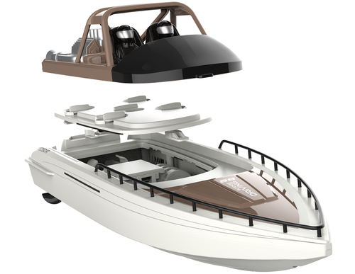 Beschreibung:Pfiffiges RC-Speedboot mit einer Gesamtlänge von 380mm, das dank aerodynamischem Design im Stile eines Rennboots für eine prima Wasserlage sorgt und sich damit ideal für Hobbykapitäne ab 8 Jahren eignet. Ausgestattet mit zwei 340er Brushed-Motoren und einem Li-lon Akku 7,4V 800mAh fährt das Aimee bis zu 15km/h schnell. Je nach Fahrweise sind etwa 15 Minuten ununterbrochener Fahrspaß möglich. Neben volle Kraft voraus lässt sich beim Manövrieren auch problemlos der Rückwärtsgang einlegen. Durch eine doppelte Abdeckung ist die Elektronik im Inneren gleich zweifach geschützt, sodass auch raue See diesem Einsteigerboot kaum etwas anhaben kann. Für zusätzliche Sicherheit sorgt die automatische Safe-Funktion, welche das Boot nur im Wasser mit dem Sender verbinden und starten lässt.Optisch ein Hingucker: Kleinere Details, wie die beiden durch einen Überrollbügel geschützten Fahrerfiguren oder die Motorapplikation am Heck mit den mächtigen acht Zylindern und den zwei Auspuffen, unterstreichen den