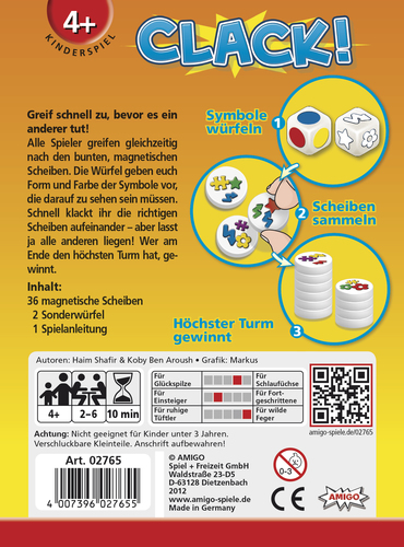 Warnhinweis: Aus der Ideen-Schmiede von Halli-Galli-Erfinder Haim Shafir kommt hier ein neues Kinderspiel, dass auch die Eltern begeistern wird. Bei Clack! spielen immer alle Spieler gleichzeitig: Einer würfelt und schon greifen alle nach den bunten, magnetischen Scheiben. Denn die Würfel geben Form und Farbe der Symbole vor, die auf den Scheiben zu sehen sein müssen. Schnell werden die richtigen Scheiben aneinander geklackt und wer am Schluss den höchsten Scheibenturm hat, gewinnt. Auf die Plätze, fertig, Clack! So spielt man Clack!: Alle magnetischen Scheiben werden so auf dem Tisch verteilt, dass die farbigen Symbole zu sehen sind. Ein Spieler würfelt mit dem Farbwürfel und dem Symbolwürfel. Alle Spieler spielen gleichzeitig. Sie greifen mit einer Hand so schnell wie möglich alle Scheiben mit dem gewürfelten Symbol in der gewürfelten Farbe, bis keine passenden Scheiben zu finden sind. Die magnetischen Scheiben klacken dabei aneinander. Danach würfelt der nächste Spieler die beiden Würfel neu und die Spieler greifen von den verbliebenen Scheiben diejenigen, die zum neuen Würfelergebnis passen. Wird eine weiße Würfelseite gewürfelt, müssen die Spieler nur auf das achten, was auf dem anderen Würfel zu sehen ist. Werden beide weißen Würfelseiten gewürfelt, müssen die Spieler weder auf die Farbe noch auf das Symbol achten. Sie greifen so schnell wie möglich nach allen Scheiben. Sind alle Scheiben von den Spielern genommen worden, endet das Spiel. Der Spieler mit dem höchsten Stapel gewinnt. Inhalt: 32 Magnetscheiben 2 Sonderwürfel 1 Spielanleitung