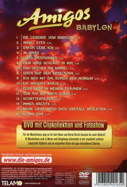 01. "Die Legende von Babylon" 02. "Angel eyes" 03. "Dafür lebe ich" 04. "36 Grad" 05. "1000 Vaterunser" 06. "Dein Herz schl?gt in mir" 07. "Das Zeichen am Himmel" 08. "Hoch auf dem Eiffelturm" 09. "Ich geh mit dir durch den Monsun" 10. "Ein weisses Kreuz" 11. "Elvis lebt in meinen Tr?umen" 12. "Von Rio bis nach Tokio" 13. "Schattenreiter" 14. "Immer nachts" 15. "Meine Liebe wird dich überall begleiten" 16. "Hitmix 2019" 17. "Fotoshow"