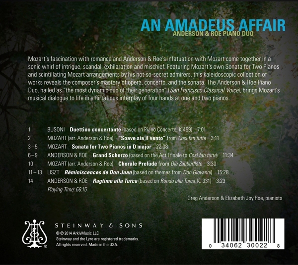 Beschreibung:Runningtime: 00:00:00, Art Direction: Jackie Fugere, Composed By: Wolfgang Amadeus Mozart, Executive Producer: Eric Feidner, Executive Producer: Jon Feidner, Photography: Bill Reitzel, Piano: Elizabeth Joy Roe, Piano: Greg Anderson (10), Producer, Recorded By: Steve Epstein, Composed By: Ferruccio Busoni, Arranged By: Anderson & Roe Piano Duo, Composed By: Anderson & Roe Piano Duo, Arranged By: Anderson & Roe Piano Duo, Composed By: Franz Liszt, Composed By: Anderson & Roe Piano Duo, Labelcode STNS30022 (STNS 30022), Phonographic Copyright (p) ArkivMusic LLC, Recorded At Concert Hall of Performing Arts Center, SUNY Purchase