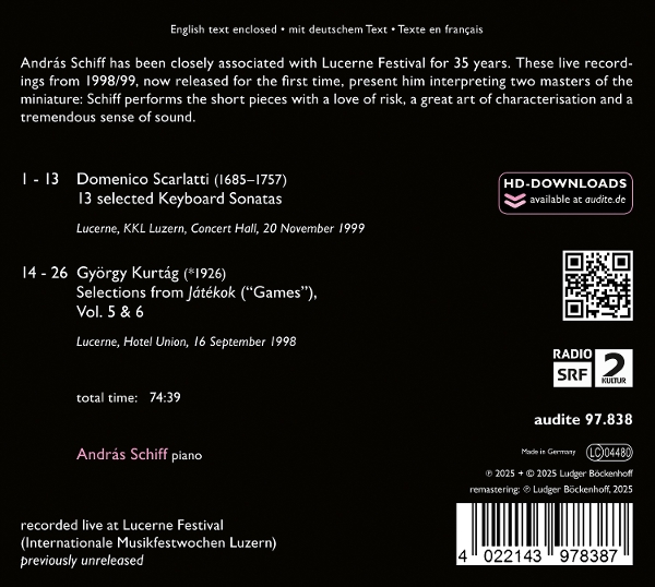 "Andras Schiff Plays Scarlatti & Kurtag - Lucerne" ist eine faszinierende CD-Veröffentlichung des renommierten Pianisten András Schiff beim Label Audite. Das Album vereint die barocken Klaviersonaten von Domenico Scarlatti mit den zeitgenössischen Miniaturen von György Kurtág ? aufgenommen live beim angesehenen Lucerne Festival. Mit großer Meisterschaft bringt Schiff sowohl die funkelnde Klarheit von Scarlattis Musik als auch die nachdenkliche Tiefe der Werke Kurtágs zum Ausdruck und lädt zu einer spannenden musikalischen Entdeckungsreise ein. András Schiff gilt weltweit als einer der bedeutendsten Pianisten unserer Zeit und wurde für seine Interpretationen u.a. von Bach, Beethoven oder Schubert vielfach ausgezeichnet ? darunter Grammy-Nominierungen und internationale Ehrungen wie der Bach-Preis der Royal Academy of Music London. Das Label Audite steht für exzellente klassische Aufnahmen auf höchstem klanglichen Niveau und verbindet künstlerische Qualität mit audiophiler Technik ? diese Veröffentlichung ist daher ein Muss für anspruchsvolle Musikliebhaber.