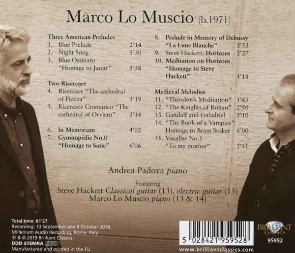 American Pr?ludes Nr. 1-3 01. Padova, Andrea "Nr. 1 Blue Pr?lude" 02. Padova, Andrea "Nr. 2 Night Song" 03. Padova, Andrea "Nr. 3 Blue Ostinato "Homage to Jarett"" Ricercare Nr. 1-2 04. Padova, Andrea "Nr. 1 The cathedral of Pienza" 05. Padova, Andrea "Nr. 2 The cathedral of Orvieto" 06. Padova, Andrea "In Memoriam" 07. Padova, Andrea "Gymnop?die Nr. 0 "Homage to Satrie"" 08. Padova, Andrea "Pr?lude in memory of Debussy "La Lune Blanche"" 09. Padova, Andrea "Horizons" 10. Padova, Andrea "Meditation on Horizons "Homage to Steve Hackett"" Medieval Melodies Nr. 1-5 11. Hackett, Steve "Nr. 1 Th?odon's meditation" 12. Hackett, Steve "Nr. 2 The knights of Rohan" 13. Hackett, Steve "Nr. 3 Gandalf and Galadriel" 14. Hackett, Steve "Nr. 4 The book of a vampire (Homage to Brom Stoker)" 15. Hackett, Steve "Nr. 5 To my mother (Vocalise Nr. 1)"