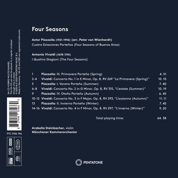 Cuatro Estaciones porte¤as (Vier Tango-Jahreszeiten) (Auszug) 01. "3. Primavera porte¤a (Frühling)" 02. "Der Frühling (Konzert E-Dur op. 8 Nr. 1 RV 269): 1. Allegro" 03. "Der Frühling (Konzert E-Dur op. 8 Nr. 1 RV 269): 2. Largo" 04. "Der Frühling (Konzert E-Dur op. 8 Nr. 1 RV 269): 3. Allegro" Cuatro Estaciones porte¤as (Vier Tango-Jahreszeiten) (Auszug) 05. "1. Verano porte¤o (Sommer)" 06. "Der Sommer (Konzert g-moll op. 8 Nr. 2 RV 315): 1. Allegro non molto" 07. "Der Sommer (Konzert g-moll op. 8 Nr. 2 RV 315): 2. Adagio" 08. "Der Sommer (Konzert g-moll op. 8 Nr. 2 RV 315): 3. Presto" Cuatro Estaciones porte¤as (Vier Tango-Jahreszeiten) (Auszug) 09. "4. Oto¤o porte¤o (Herbst)" 10. "Der Herbst (Konzert F-Dur op. 8 Nr. 3 RV 293): 1. Allegro" 11. "Der Herbst (Konzert F-Dur op. 8 Nr. 3 RV 293): 2. Adagio molto" 12. "Der Herbst (Konzert F-Dur op. 8 Nr. 3 RV 293): 3. Allegro" Cuatro Estaciones porte¤as (Vier Tango-Jahreszeiten) (Auszug) 13. "2. Invierno porte¤o (Winter)" 14. "Der Winter (Konzert f-moll op. 8 Nr. 4 RV 297): 1. Allegro non molto" 15. "Der Winter (Konzert f-moll op. 8 Nr. 4 RV 297): 2. Largo" 16. "Der Winter (Konzert f-moll op. 8 Nr. 4 RV 297): 3. Allegro"