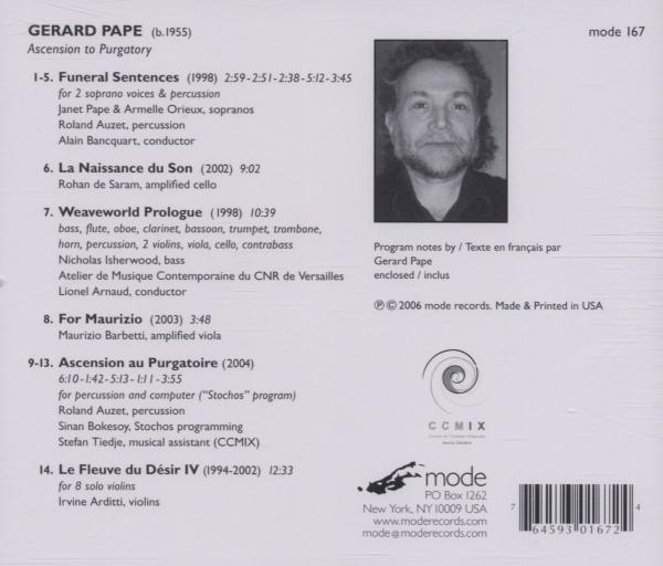 Beschreibung:Runningtime: 00:00:00, Artwork [Cover Image]: Ana Paula Portilla, Composed By, Producer, Liner Notes: Gérard Pape, Edited By: Stefan Tiedje, Executive-Producer, Art Direction: Brian Brandt, Mastered By: Steve Puntolillo, Musical Assistance: Stefan Tiedje, Photography By: Louis-Daniel Pape, Programmed By [Stochos]: Sinan Bökesoy, Recorded By: Stefan Tiedje, Recorded By, Producer: Thierry Balasse, Conductor: Alain Bancquart, Percussion: Roland Auzet, Soprano Vocals: Armelle Orieux, Soprano Vocals: Janet Pape, Cello [Amplified]: Rohan de Saram, Bass Vocals: Nicholas Isherwood, Bassoon: Alexandre Ouzounoff, Cello: Floraine Vieux-Rochas, Clarinet: Krista Martynes, Conductor: Lionel Arnaud, Double Bass: Hui-ying Yang, Ensemble: Atelier De Musique Contemporaine Du CNR De Versailles, Flute: Miraka Nasu, Horn: Isabelle Varraux, Oboe: Lois Hedde, Percussion: Pierre Lacroix, Trombone: Hiroyuki Morooka, Trumpet: François Pallies, Viola: Estelle Marsal, Violin: Takuro Ikezawa, Violin: Violaine Reboul, Producer: Stefan Tiedje, Viola [Amplified]: Maurizio Barbetti, Percussion: Roland Auzet, Violin: Irvine Arditti, Labelcode MOD167.2 (mode 167), Recorded At Studios La Muse En Circuit, Recorded At CCMIX