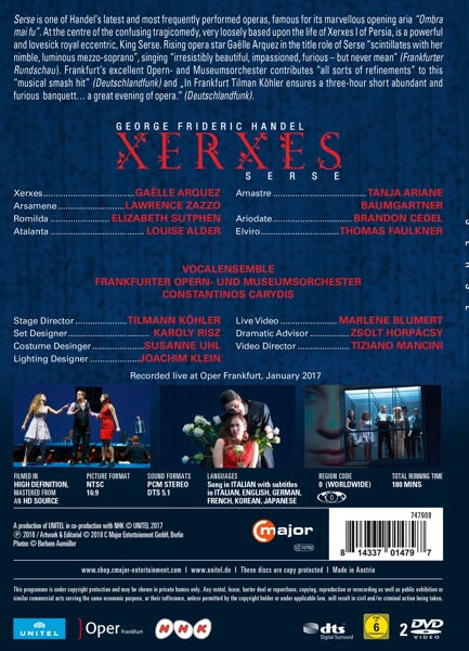 Beschreibung:Serse is one of Handel's latest and most frequently performed operas, famous for it's marvelous opening aria "Ombra mai fu." At the center of the confusing tragicomedy, very loosely based upon the life of Xerxes I of Persia, is a powerful and lovesick royal eccentric, King Serse. Rising opera star Gaelle Arquez in the title role of Serse "scintillates with her nimble, luminous mezzo-soprano", singing "irresistibly beautiful, impassioned, furious - but never mean" (Frankfurter Rundschau). Frankfurt's excellent Opern- and Museumsorchester contributes "all sorts of refinements" to this "musical smash hit" (Deutschlandfunk) and "In Frankfurt Tilman Kohler ensures a three-hour short abundant and furious banquett... a great evening of opera." (Deutschlandfunk)., Runningtime: 00:00:00, Labelcode CMAJ747908DVD