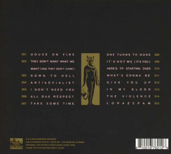 01. "House on fire" 02. "They don't want what we want (and they don't care)" 03. "Down to hell" 04. "Antisocialist" 05. "I don't need you" 06. "All due respect" 07. "Take some time" 08. "One turns to none" 09. "It's not me (it's you)" 10. "Here's to starting over" 11. "What's gonna be" 12. "Give you up" 13. "In my blood" 14. "The violence" 15. "Lorazepam"