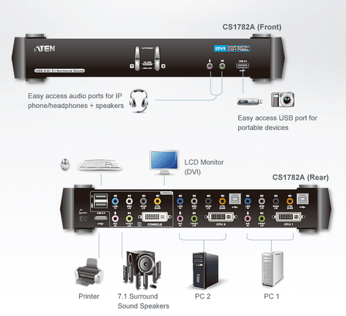 Beschreibung: | ? DVI-Interface, max. Auflösung bis 2560 x 1600 ? 120 Hz 3D Display-Unterstützung ? NVIDIA 3D Vision Ready-Zertifizierung ? perfekter Sound durch 7.1 Audio-Unterstützung ? Anschlussmöglichkeit für 2 ? gemeinsam genutzte USB 2.0 Peripheriegeräte ? PC-Auswahl über Tasten, Mausclick oder Hotkeyfunktion ? automatisches Scannen der PCs (1-99 Sek.) ? Power In Detection: nach Herunterfahren eines PCs wird automatisch zum nächsten eingeschalteten PC gewechselt ? LED Statusanzeige ? Spannungsversorgung über Steckernetzteil (Tastatur,Maus), Maus-/Tastatursimulation f. NT/NovellAuflösung DVI-D: 2560 x 1600 @60Hz, incl. 2xKVM-Kabel Set, Console: 1xDVI(Buchse), 4xAudio(Buchse), 2xUSB(Buchse) PC 1-2: je(1xDVI Buchse, 1xUSB(Buchse), 2xAudio(Buchse)) Der USB-KVMP -Switch für DVI-Grafik (Dual Link) CS1782A schlägt eine moderne Richtung hinsichtlich KVM-Switch-Funktionalität ein. Er vereint die Funktionen eines 2-Port-KVM-Switches mit denen eines 2-Port-USB-Hubs und stellt gleichzeitig eine Schnittstelle zur DVI-Bild- und Tonübertragung zur Verfügung. Weiterhin ist das Gerät mit modernster Technik bestückt, darunter nVidia 3D Vision ready mit 120 Hz, Kompatibilität für Spieltastaturen sowie die Portumschaltung per Mausklick - alles ausgerichtet für maximaschwarz, 2-Port, 7.1-Sound, DVI22 Ports22Hauptmerkmale rn rn Konnektivität rn Konnektivitättechnologie verkabelt rn Anzahl USB 2.0 Anschlüsse 1 rn Lautsprecher/Köpfhörer/Line-Out Anschluss 1 rn Mikrofon, Line-In Anschluss 1 rn DC-IN Steckfassung Ja rn Tastatur Porttyp USB, PS/2 rn Maus Porttyp USB, PS/2 rn Video Porttyp DVI-I rn rn Gewicht u. Abmessungen rn Abmessungen B x T x H 270 x 87 x 55 mm rn Gewicht 900 g rn rn Energiemanagement rn Energieverbrauch 9 W rn Stromversorgung - Eingang Spannung 5.3 V rn rn Umweltbedingungen rn Luftfeuchtigkeit bei Betrieb 0 - 80 % rn Temperaturbereich bei Betrieb 0 - -50 °C rn Temperaturbereich bei Lagerung 20 - 60 °C rn rn Farbe rn Produktfarbe Schwarz rn rn Anzeige rn Maximale Auflösung 2560 x 1600 Pixel rn Auflösung (maximal, analog) 1920 x 1080 Pixel rn Auflösung (maximal, digital) 1920 x 1200 Pixel rn rn Management features rn Anzeigeleuchten Ja rn rn Verpackungsinhalt rn Schnellinstallationsanleitung Ja rn BenutzerhandbuchDer Artikel "CubiQ CS1782A - KVM-/Audio-Switch - USB - 2 x KVM/Audio - 1 lokaler Benutzer - D..." von der Marke Aten ist Schwarz. Das Produkt hat ein Gewicht von 900 g. Der Artikel besitzt folgende Maße: 270 x 87 x 55 mm (BxTxH). Das Produkt besteht aus Metall. |  | Herstellernummer: |