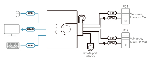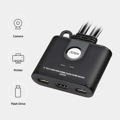 Steigern Sie Ihre Effizienz mit dem kompakten CS22HF HDMI KVM-Switch und arbeiten Sie mühelos auf mehreren Geräten gleichzeitig. Mit nur einer Tastatur, Maus und einem Monitor wechseln Sie per Knopfdruck zwischen zwei Computern und genießen brillante Full-HD-Bildqualität für klare und präzise Darstellung bei jeder Anwendung. Die Einrichtung ist denkbar einfach ? schließen Sie das Gerät über USB und HDMI an, und es ist sofort einsatzbereit. Dank des patentierten All-in-One-Designs (Kabel + KVM) bleibt Ihr