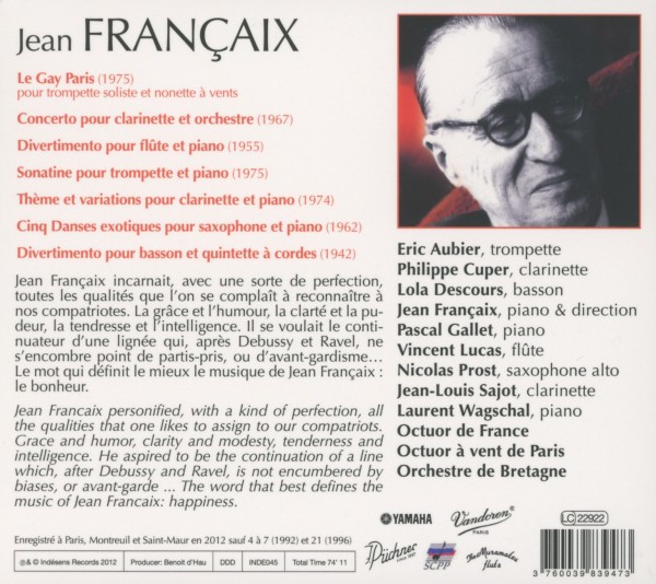 Le gay Paris (1975) 01. Aubier, Eric "1. Marche" 02. Aubier, Eric "2. Valse" 03. Aubier, Eric "3. Galop" Konzert für Klarinette und Ochester (1967) 04. Cuper, Philipper "1. Allegro" 05. Cuper, Philipper "2. Scherzando" 06. Cuper, Philipper "3. Andantino" 07. Cuper, Philipper "4. Allegrissimo" Divertimento für Fl?te und Klavier (1955) 08. Lucas, Vincent "1. Toccatina" 09. Lucas, Vincent "2. Notturna" 10. Lucas, Vincent "3. Perpetuum mobile" 11. Lucas, Vincent "4. Romanza" 12. Lucas, Vincent "5. Finale" Sonatine für Trompete und Klavier (1975) 13. Aubier, Eric "1. Pr?lude" 14. Aubier, Eric "2. Sarabande" 15. Aubier, Eric "3. Gigue" 16. Fran?aix, Jean "Thema und Variationen für Klarinette und Klavier (1974)" Cinq danses exotiques (für Saxophone und Klavier) (1962) 17. Prost, Nicolas "1. Pambiche" 18. Prost, Nicolas "2. Baiao" 19. Prost, Nicolas "3. Mambo" 20. Prost, Nicolas "4. Samba" 21. Prost, Nicolas "5. Merengue" Divertimento für Fagott und Streichquintett 22. Descours, Lola "1. Vivace" 23. Descours, Lola "2. Lento" 24. Descours, Lola "3. Vivo assai" 25. Descours, Lola "4. Allegro"