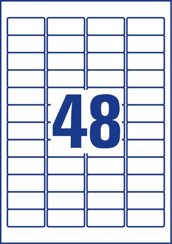 Details: Media Medientyp Abziehbare Etiketten Drucktechnologie Laser Medienfarbe Weiß Anz. Karten/Etiketten pro Blatt/Rolle 48 Enthaltene Menge 25 Stck