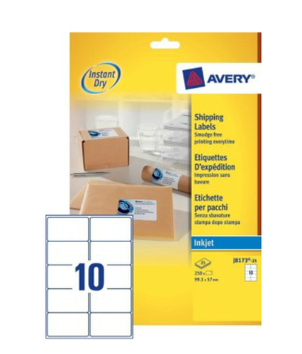 Der Artikel "Quick DRY J8173 - Adressetiketten - weiß - 57 x 99,1 mm - 250 Stck. (25 Bo..." von Avery ist Weiß. Das Produkt ist aus Papier. Der Artikel nutzt Tintenstrahl als Druckmethode.