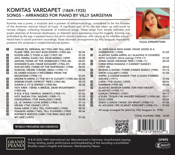 01. "CHinar es, keranal mi (Du bist groß wie eine Platane, verbeuge dich nicht) (bearb. für Klavier solo von Villy Sargsyan)" 02. "Kuzhn ara (Ich nahm einen Krug) (bearb. für Klavier solo von Villy Sargsyan)" 03. "Akh, Maral djan (Ah, lieber Maral) (bearb. für Klavier solo von Villy Sargsyan)" 04. "Antuni (Lied des Obdachlosen) (bearb. für Klavier solo von Villy Sargsyan)" 05. "Shogher djan (Lieber Shogher) (bearb. für Klavier solo von Villy Sargsyan)" 06. "Kak'avi erg (Lied des Rebhuhns) (bearb. für Klavier solo von Villy Sargsyan)" 07. "Kanche, krunk (Kranich, sing) (bearb. für Klavier solo von Villy Sargsyan)" 08. "Es saren kugayi (Ich kehrte vom Berg zurück) (bearb. für Klavier solo von Villy Sargsyan)" 09. "Erkink'n ampel e (Der Himmel ist bew?lkt) (bearb. für Klavier solo von Villy Sargsyan)" 10. "Dsirani dsar (Aprikosenbaum) (bearb. für Klavier solo von Villy Sargsyan)" 11. "Garun a (Es ist Frühling) (bearb. für Klavier solo von Villy Sargsyan)" 12. "Hov arek' (Sendet eine Brise, liebe Berge) (bearb. für Klavier solo von Villy Sargsyan)" 13. "K'ele, k'ele (Marschiert, marschiert) (bearb. für Klavier solo von Villy Sargsyan)" 14. "Hoy, Nazan (Oh, Nazan) (bearb. für Klavier solo von Villy Sargsyan)" 15. "Dsedsernak (Die Schwalbe) (bearb. für Klavier solo von Villy Sargsyan)" 16. "Le, le yaman (Liebeslied) (bearb. für Klavier solo von Villy Sargsyan)" 17. "Krunk (Der Kranich) (bearb. für Klavier solo von Villy Sargsyan)" 18. "Mani asem (Ich werde wahrsagen) (bearb. für Klavier solo von Villy Sargsyan)" 19. "Dsaghik asem (Ich werde den Blumen erz?hlen) (bearb. für Klavier solo von Villy Sargsyan)" 20. "Matnik'e matovs cher (Der Ring war nicht in meiner Gr?ße) (bearb. für Klavier solo von Villy Sargsyan)" 21. "Al dzin naln inch kane (Was nützt ein Hufeisen) (bearb. für Klavier solo von Villy Sargsyan)" 22. "Alagyaz (Sarn ampel a) (Alagyaz ist von Wolken bedeckt) (bearb. für Klavier solo von Villy Sargsyan)" 23. "Khnki dsar (Weihrauchbaum) (bearb. für Klavier solo von Villy Sargsyan)" 24. "Chem krna khagha (Ich kann nicht tanzen) (bearb. für Klavier solo von Villy Sargsyan)" 25. "Maron a kayne (Da steht Maro) (bearb. für Klavier solo von Villy Sargsyan)" 26. "Or?r (Wiegenlied) (bearb. für Klavier solo von Villy Sargsyan)" 27. "Ampel a kamar-kamar (Die Wolken formten B?gen) (bearb. für Klavier solo von Villy Sargsyan)" 28. "Lorik (Die Wachtel) (bearb. für Klavier solo von Villy Sargsyan)" 29. "Habrban (bearb. für Klavier solo von Villy Sargsyan)" 30. "Alagyaz (Bardzr sarin) (Auf dem hohen Berg Alagyaz) (bearb. für Klavier solo von Villy Sargsyan)" 31. "Garun (Frühling) (bearb. für Klavier solo von Villy Sargsyan)" 32. "K'eler, tsoler (Er lief strahlend) (bearb. für Klavier solo von Villy Sargsyan)" 33. "Zulo (bearb. für Klavier solo von Villy Sargsyan)" 34. "Zinch u zinch (Was, oh was (bearb. für Klavier solo von Villy Sargsyan)" 35. "Al aylukhs (Mein scharlachrotes Tuch) (bearb. für Klavier solo von Villy Sargsyan)"