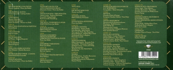 Beschreibung:Johann Sebastian Bach's stature as a composer of extraordinary talent and widespread influence is so firmly established in Western culture that it is difficult to believe that only 150 years ago his works lay in veritable obscurity, unknown to all but a small group of scholars. It is largely thanks to ohn, who essentially effected a revival of the composer's music through his rediscovery and promulgation of the St Matthew Passion, besides other pieces, that his works are today regarded as pinnacles of music expression. That they are among the most performed and widely attended is in no doubt; in Holland alone, thousands of singers and musicians are involved in dozens of performances of the St Matthew Passion in Holy Week, with hundreds of thousands listening in churches and concert halls, or gathered around the radio, to what has been described as 'the Gospel according to Bach'. Bringing together all of his works, this dynamic 142-CD set offers a resounding impression of this great spirit of our Western culture, presenting dynamic performances - many period-based, many acclaimed by the international press - that are divided according to genre, thus making for a highly user-friendly compendium. The set draws on all periods of his career, tracing the development of a style that was much influenced by contemporary and past fashions but which was always adapted to Bach's own purpose, often far surpassing the models on which he drew. The German composer travelled a great deal from city to city, and the different circumstances of his various positions are reflected in the great range of works comprising his output: while his early years are dominated by much keyboard music, on account of the numerous organist posts he held during this period, later positions at various courts accorded him more personal and artistic freedom - in Cothen, for example, Prince Leopold's passion for music-making and his renowned resident orchestra resulted in a string of unforgettable works including the Brandenburg Concertos, the Solo Cello Suites and the Well-Tempered Clavier Part 1, beside many others. Bach was a master of all genres, whether sacred, secular, instrumental or vocal, and his oeuvre is a rich mixture of severe Baroque craftsmanship and expressive Romanticism. Thomas Zehetmair, Kristof Barati, the Gewandhausorchester Leipzig, Rene Jacobs, Peter Schreier and Lucia Popp are just a handful of the first-class performers and ensembles gracing this set. At the bargain price of EUR100, it is a collection not to be passed up. Other information: - 142 CDs representing the entirety of Johann Sebastian Bach's oeuvre in historically informed performances. This includes all 200 sacred cantatas recorded for Brilliant Classics on period instruments and sung by the Holland Boys Choir. - For reasons of completeness, pure musical enjoyment, scholarly research, attractive, spacesaving design and price, you cannot afford to be without Brilliant Classics' Complete Bach Edition. - Extensive liner notes, sungs texts and complete tracklisting with performers available for download, by clicking on 'Download booklet' below the cover., Labelcode BRLT97509.2