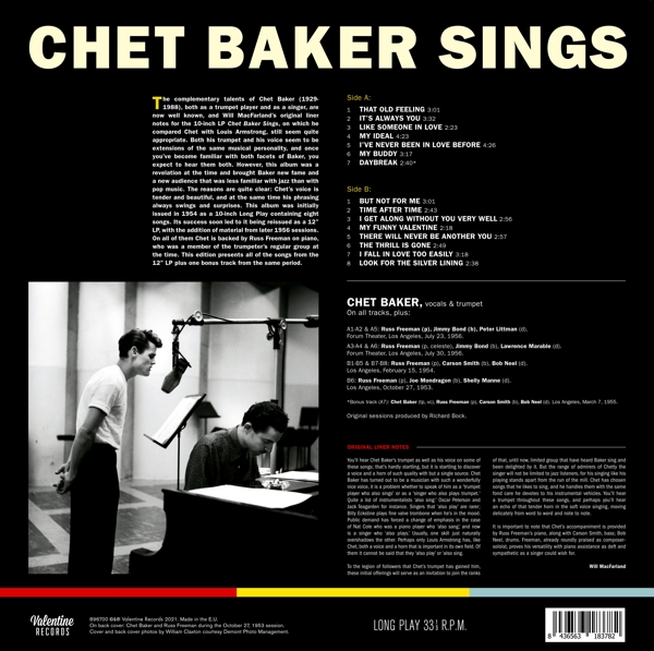 | Beschreibung: | Chet Baker Sings + 1 Bonus Track (Limited Edition 180 Gram Vinyl). The complete iconic LP + bonus track on 180g vinyl. Includes photographs taken during the albums sessions by William Claxton. The jazz world was amazed when trumpeter Chet baker presented this, his first vocal album, which showed that his immense talent as a singer matched his brilliance as an instrumentalist. This icon album includes such hits as My Funny Valentine and I Fall In Love Too Easily This album was initially issued in 1954 as a 10-inch containing eight songs. It's success soon led to it being reissued as a 12 LP, with the addition of material from later 1956 sessions. This edition presents all the songs from the 12 LP plus one bonus track from the same period. CHET BAKER, vocals & trumpet. Plus: Russ Freeman (p), Jimmy Bond (b), Joe Mondragon (b) Peter Littman (d), Lawrence Marable (d), Bob Neel (d), Shelly Manne (d). Sessions recorded between 1953 and 1956, Los Angeles. USA., Runningtime: 00:00:00, Liner Notes: Will MacFarland, Photography By: William Claxton, Producer: Richard Bock, Labelcode IMT6318378.1 (896700) |