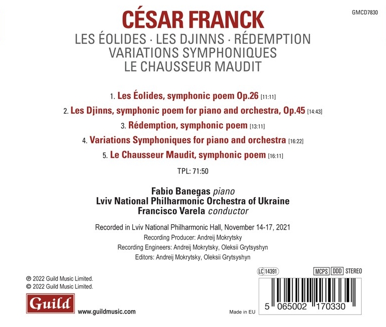 Beschreibung:Released for this bicentennial year of Cesar Franck's birth (1822-2022), this recording of the most popular of Franck's symphonic poems, including Les Djinns and the Symphonic Variations that feature piano, has taken on an additional significance and poignancy with the outbreak of war in the orchestra's homeland only a few months after these sessions were completed. As a result, Guild will be making a donation to the Disasters Emergency Committee's Ukraine appeal for every CD sold. A recipient of numerous awards in Argentina and in the United States, Fabio Banegas was the only student of Argentine composer José Antonio Bottiroli (1920 - 1990). He continued his education in the United States obtaining a Masters of Music (MM) at California State University Fullerton (CSUF) He has recorded live all main piano works for solo piano, chamber music and piano and orchestra by César Franck. Banegas has appeared as a recitalist and as a soloist in the United States, Argentina and Europe. A conductor, composer and orchestra programmer from Buenos Aires, Argentina, Francisco Varela has committed his work to widen the traditional music repertoire and the transformation of orchestras from his country to serve the needs of the 21th century. A recipient of numerous awards and scholarships, he graduated with honors from the Catholic University of Argentina (UCA) and he holds a Masters in Conducting from PennState University in the US. The Lviv National Philharmonic Orchestra of Ukraine headquartered in the Medieval city of Lviv was officially established on September 27, 1902 as, on this day, the first concert of the newly formed orchestra took place in the Philharmonic Theatre of Count Stanislav Skarbko (presently known as the Ukrainian National Academic Theatre of Drama named after Maria Zankovetska). In 1933, the orchestra became incorporated as the Lviv National Philharmonic Orchestra of Ukraine., Runningtime: 00:00:00, Labelcode GUD7830.2