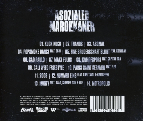 Beschreibung:Artwork: Kevin "Tyran" Felk, Artwork: PAtrick "Famous Graphix" Tropschug, Executive-Producer: Farid Hamed El Abdellaoui, Mastered By: Yunus Cimen, Photography By: Denis Ignatov, Recorded By: Mehmet "Eddy" Erdem Eroglu, Recorded By: Samuele Frijo, Recorded By, Mixed By: Kai Kotucz, Recorded By, Mixed By: Melvin Schmitz, Producer: Kyree, Producer: Mesh (21), Producer: Kyree, Producer: Kyree, Producer: Mesh (21), Featuring: Ssio, Producer: Kyree, Producer: Swy V, Featuring: Kollegah, Producer: Kyree, Producer: Mesh (21), Producer: Reaf (2), Producer: Frio (7), Producer: Kyree, Producer: Kyree, Featuring: Capital Bra, Producer: 27th, Producer: B-Case, Producer: Beatzarre, Producer: Djorkaeff, Producer: Elyas (4), Producer: Kyree, Featuring: Fler, Producer: Simes Branxons, Producer: Kyree, Producer: Mehmet "Eddy" Erdem Eroglu, Featuring: Adel Tawil, Featuring: Haftbefehl (2), Producer: Kyree, Producer: Mesh (21), Featuring: Azad, Featuring: Elif (3), Featuring: Summer Cem, Producer: Kyree, Producer: Mesh (21), Producer: Kyree, Lyrics By: Farid Hamed El Abdellaoui, Music By: Kai Kotucz, Producer: Kyree, Featuring: Jamule, Lyrics By: Farid Hamed El Abdellaoui, Lyrics By: Jamal Serrano, Music By: Kai Kotucz, Music By: Samuele Frijo, Featuring: Capo (7), Featuring: Veysel, Lyrics By: Cem Anhan, Lyrics By: Farid Hamed El Abdellaoui, Lyrics By: Veysel Gelin, Music By: Kai Kotucz, Music By: Melvin Schmitz, Music By: Samuele Frijo, Lyrics By: Farid Hamed El Abdellaoui, Music By: Kai Kotucz, Producer: Kyree, Featuring: Jamule, Featuring: The Game (2), Lyrics By: Farid Hamed El Abdellaoui, Lyrics By: Jamal Serrano, Lyrics By: Jayceon Taylor, Music By: Kai Kotucz, Music By: Samuele Frijo, Producer: Frio (7), Producer: Kyree, Labelcode 505419710425 (none, none), Copyright (c) Banger Musik GmbH, Phonographic Copyright (p) Banger Musik GmbH, Distributed By Warner Music Group Germany Holding GmbH, Published By Edition Farid Bang, Published By Hanseatic Musikverlag GmbH & Co KG, Published By Warner Chappell Music Germany GmbH & Co. KG, Published By Copyright Control, Published By Edition Maskulin, Published By Universal Music Publishing, Published By Adel El Tawil Publishing, Published By Song Legend Publishing GmbH, Published By Sony ATV, Published By Edition Halal Mo