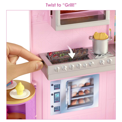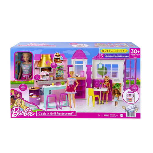 Beschreibung:Mit dem Barbie Restaurant Spielset mit Puppe können kleine Feinschmecker die verschiedensten Geschichten servieren! Dieses bunte Spielset in modernem Design zum Thema Café mit sechs Spielbereichen und mehr als 30 Teilen regt zu endlosem fantasievollem Spielen an. Die Barbie-Puppe ist in ihrem Kleid, der pinken Schürze und der Kochmütze bereit für ihren Arbeitstag. Kinder können ihr dabei helfen, Bestellungen zum Mitnehmen aufzunehmen oder bis zu vier Gäste an der Theke und auf der Terrasse zu empfangen. Dann geht es ab in die Küche. Dort können Burger auf dem rotierenden Grill gebraten und köstliche Nachspeisen auf der sich drehenden Dessert-Platte angerichtet werden. Die Pizza kann in den Ofen geschoben werden, bis sie fertig gebacken ist und ihre Farbe wechselt! Mit den 30+ Teilen und so vielen Möglichkeiten zum Geschichten erzählen können Kinder ab 3 Jahren mit Barbie die Rolle des Kochs, der Bedienung, eines Kunden oder alles auf einmal einnehmen! Die Puppe kann nicht von allein stehen. Abweichungen in Farbe und Gestaltung vorbehalten.