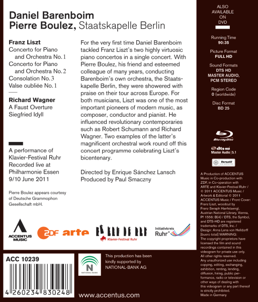 01. (keine Angaben) "Vorspann" 02. Boulez, Pierre "Eine Faust-Ouvertüre" Konzert für Klavier und Orchester Nr. 2 A-Dur S 125 03. Barenboim, Daniel "Adagio sostenuto assai" 04. Barenboim, Daniel "Allegro agitato assai" 05. Barenboim, Daniel "Allegro moderato" 06. Barenboim, Daniel "Allegro deciso" 07. Barenboim, Daniel "Marziale un poco meno allegro" 08. Barenboim, Daniel "Allegro animato" 09. Boulez, Pierre "Siegfried-Idyll" Konzert für Klavier und Orchester Nr. 1 Es-Dur S 124 10. Barenboim, Daniel "Allegro maestoso" 11. Barenboim, Daniel "Quasi adagio" 12. Barenboim, Daniel "Allegretto vivace - Allegro animato" 13. Barenboim, Daniel "Allegro marziale animato" Consolations S 172 Nr. 1-6 (Auszug) 14. Barenboim, Daniel "Nr. 3: Des-Dur" 15. Barenboim, Daniel "Valse oubli?e Nr. 1 S 215,1" 16. (keine Angaben) "Abspann"