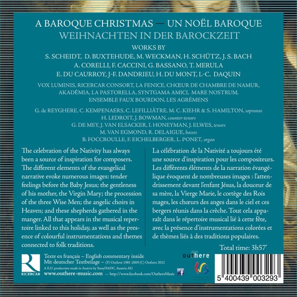 Disc 01 01. Vox Luminis "Ein Kind geborn zu Bethlehem (Puer natus in Bethlehem)" 02. Foccroulle, Bernard "Puer natus in Bethehem BuxWV 217 (Choralvorspiel)" 03. De Reyghere, Greta "Gegrüßet seist du" 04. La Fenice "Angelus ad pastores ait" 05. Ricercar-Consort "Es ist ein Ros' entsprungen" 06. Foccroulle, Bernard "Wie sch?n leuchtet der Morgenstern BuxWV 223 (Choralfantasie)" Historia der freudenreichen Geburt Jesu Christi SWV 435: Eingang 07. Akad?mia "Eingang" Historia der freudenreichen Geburt Jesu Christi SWV 435: Evangelist - Intermedium 1 (Der Engel zu den Hirten auf dem Fel 08. Akad?mia "Evangelist - Intermedium 1 (Der Engel zu den Hirten auf dem Felde)" Historia der freudenreichen Geburt Jesu Christi SWV 435: Evangelist - Intermedium 2 (Die Menge der Engel) 09. Akad?mia "Evangelist - Intermedium 2 (Die Menge der Engel)" Historia der freudenreichen Geburt Jesu Christi SWV 435: Evangelist - Intermedium 3 (Die Hirten auf dem Felde) 10. Akad?mia "Evangelist - Intermedium 3 (Die Hirten auf dem Felde)" Historia der freudenreichen Geburt Jesu Christi SWV 435: Evangelist - Intermedium 4 (Die Weisen aus dem Morgenlande) 11. Akad?mia "Evangelist - Intermedium 4 (Die Weisen aus dem Morgenlande)" Historia der freudenreichen Geburt Jesu Christi SWV 435: Evangelist - Intermedium 5 (Hohepriester und Schriftgelehrte) 12. Akad?mia "Evangelist - Intermedium 5 (Hohepriester und Schriftgelehrte)" Historia der freudenreichen Geburt Jesu Christi SWV 435: Evangelist - Intermedium 6 (Herodes) 13. Akad?mia "Evangelist - Intermedium 6 (Herodes)" Historia der freudenreichen Geburt Jesu Christi SWV 435: Evangelist - Intermedium 7 (Der Engel zu Joseph) 14. Akad?mia "Evangelist - Intermedium 7 (Der Engel zu Joseph)" Historia der freudenreichen Geburt Jesu Christi SWV 435: Evangelist - Intermedium 8 (Der Engel zu Joseph in ?gypten) 15. Akad?mia "Evangelist - Intermedium 8 (Der Engel zu Joseph in ?gypten)" Historia der freudenreichen Geburt Jesu Christi SWV 435: Evangelist - Beschluss 16. Akad?mia "Evangelist - Beschluss" 17. Eichelberger, Freddy "Sonata sopra La Monica" 18. Lefilli?tre, Claire "Ihr Hirten verlasset die finstere Nacht" 19. De Mey, Guy "Das neugeborne Kindelein BuxWV 13 (Weihnachts-Kantate)" 20. Vox Luminis "Das alte Jahr vergangen ist"