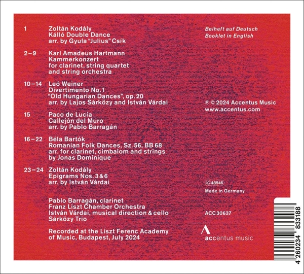 Beschreibung:The album SZINERGIA celebrates the interconnectedness of composers who, despite leading different lives, found common ground in the dance rhythms and folk traditions that inspired their music. At the heart of this album is Karl Amadeus Hartmann's Kammerkonzert for clarinet, string quartet, and string orchestra, a poignant homage to Zoltán Kodály. Hartmann's work epitomizes the synergy of musical ideas, blending the spirit of Hungarian folk music with a modern, introspective voice.Zoltán Kodály's Kálló Double Dance and Epigrams Nos. 3 & 6 showcase his profound connection to Hungarian traditions. These pieces, reimagined through contemporary arrangements, reveal the timeless nature and the vibrant energy of his melodies.Léo Weiner's Divertimento No. 1 "Old Hungarian Dances" adds a nostalgic yet lively dimension to the album. The expert arrangements by Lajos Sárközy and István Várdai breathe new life into these classic dances, highlighting the enduring appeal of Hungarian folk music.Paco de Lucía's Callejón del Muro brings a touch of Andalusian passion to the collection. Pablo Barragán's arrangement seamlessly integrates the fiery flamenco rhythms into the album's narrative, illustrating the universal language of dance that transcends cultural boundaries.Béla Bartók's Romanian Folk Dances, arranged for clarinet, cimbalom, and strings by Jonas Dominique in dedication to Swedish clarinetist Martin Fröst, further enriches the album's tapestry. Bartók's dedication to preserving folk music traditions shines through in these lively, evocative dances, demonstrating his deep connection to the musical heritage of Eastern Europe.Performed by clarinetist Pablo Barragán, the Franz Liszt Chamber Orchestra under the musical direction of István Várdai, and the Sárközy Trio, SZINERGIA presents a rich, multifaceted soundscape. Each piece highlights the unique voice of it's composer while uncovering the profound connections that link them. SZINERGIA is a celebration of the unity found in diversity. Through the lively rhythms and evocative melodies, listeners are invited to experience the harmonious dance of parallel lives, bound together by the shared threads of musical inspiration., Runningtime: 00:00:00, Labelcode ACCT30637.2