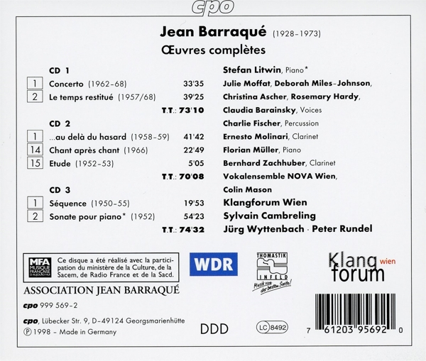 Disc 01 01. Klangforum Wien / Cambreling, Sylvain / Molinari, Ernesto "Concerto pour six formations instrumentales et deux instr..." Le temps restitu? (für Sopran, Chor und Orchester) (nach ... 02. Klangforum Wien / Cambreling, Sylvain / Vokalensemble NOVA Wien "1. La loi et le temps" 03. Klangforum Wien / Cambreling, Sylvain / Vokalensemble NOVA Wien "2. Symbole de nuit" 04. Klangforum Wien / Cambreling, Sylvain / Vokalensemble NOVA Wien "3. Portail de la terreur" 05. Klangforum Wien / Cambreling, Sylvain / Vokalensemble NOVA Wien "4. ...L'inach?vement sans cesse" 06. Klangforum Wien / Cambreling, Sylvain / Vokalensemble NOVA Wien "5. Car ce n'est que par l'erreur"