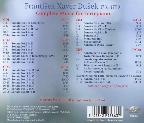 Disc 01 Sonate für Klavier Nr. 1 B-Dur 01. Bartoccini, Marius "1. Allegro" 02. Bartoccini, Marius "2. Adagio" 03. Bartoccini, Marius "3. Tempo di minuetto pi? tosto allegro" Sonate für Klavier Nr. 2 G-Dur 04. Bartoccini, Marius "1. Allegro" 05. Bartoccini, Marius "2. Andante" 06. Bartoccini, Marius "3. Tempo di Menuetto" Sonate für Klavier Nr. 3 B-Dur 07. Bartoccini, Marius "1. Allegro" 08. Bartoccini, Marius "2. Adagio" 09. Bartoccini, Marius "3. Menuett" Sonate für Klavier Nr. 4 A-Dur 10. Bartoccini, Marius "1. Allegro moderato" 11. Bartoccini, Marius "2. Menuett" Sonate für Klavier Nr. 5 G-Dur 12. Bartoccini, Marius "1. Allegro" 13. Bartoccini, Marius "2. Andantino" 14. Bartoccini, Marius "3. Allegro"