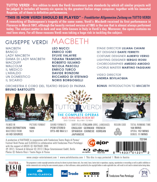Disc 01 Macbeth (Oper in 4 Akten) (Gesamtaufnahme) 01. Bartoletti, Bruno "Preludio" 02. Bartoletti, Bruno "Che faceste? Dite su! (1. Akt)" 03. Bartoletti, Bruno "Giorno non vidi mai" 04. Bartoletti, Bruno "Due vatuicini compiuti or sono" 05. Bartoletti, Bruno "S'allontanarono!" 06. Bartoletti, Bruno "Nel d¨ della vittoria io le incontrai" 07. Bartoletti, Bruno "Vieni! T'affretta!" 08. Bartoletti, Bruno "Ot tutte sorgete, o furie infernali" 09. Bartoletti, Bruno "Oh, donna mia!" 10. Bartoletti, Bruno "Sappia la sposa mia!" 11. Bartoletti, Bruno "Fatal mia donna!" 12. Bartoletti, Bruno "Di destarlo per tempo il re m'impose" 13. Bartoletti, Bruno "Schiudi, inferno, la bocca" 14. Bartoletti, Bruno "Perch? mi sfuggi (2. Akt)" 15. Bartoletti, Bruno "La luce langue" 16. Bartoletti, Bruno "Chi v'impose unirvi a noi?" 17. Bartoletti, Bruno "Studia il passo, o mio figlio" 18. Bartoletti, Bruno "Salve, o re!" 19. Bartoletti, Bruno "Si colmi il calice" 20. Bartoletti, Bruno "Che ti scosta, o re mio sposo" 21. Bartoletti, Bruno "Sangue a me quell'ombra chiede" 22. Bartoletti, Bruno "Non basta una vittima (3. Akt)" 23. Bartoletti, Bruno "Ballo" 24. Bartoletti, Bruno "Finch? appelli" 25. Bartoletti, Bruno "Dalle basse e dall'alte regioni" 26. Bartoletti, Bruno "Fuggi, regal fantasima" 27. Bartoletti, Bruno "Ondine e silfidi" 28. Bartoletti, Bruno "Ove son io?" 29. Bartoletti, Bruno "Patria oppressa! (4. Akt)" 30. Bartoletti, Bruno "O figli, o figli miei!" 31. Bartoletti, Bruno "Ah, la paterna mano" 32. Bartoletti, Bruno "Dove siam?...La patria tradita" 33. Bartoletti, Bruno "Vegliammo invan due notti" 34. Bartoletti, Bruno "Una macchia ? qui tuttora" 35. Bartoletti, Bruno "Perfidi! All'anglo contro me v'unite!" 36. Bartoletti, Bruno "Piet?, rispetto, onore" 37. Bartoletti, Bruno "Ella ? morta!" 38. Bartoletti, Bruno "Via le fronde, e mano all'armi!" 39. Bartoletti, Bruno "Vittoria! Vittoria...Macbeth, ov'??" 40. (keine Angaben) "Applaus und Abspann" 41. Bartoletti, Bruno "Introduction to Macbeth"