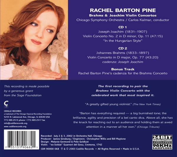 Beschreibung:Runningtime: 00:00:00, Conductor: Carlos Kalmar, Design: Melanie Germond, Design: Pete Goldlust, Engineer: Bill Maylone, Engineer: Christopher Willis, Orchestra: Chicago Symphony Orchestra, Photography By: Andrew Eccles, Producer: James Ginsburg, Technician [Luthier/Violin Technician]: Whitney Osterud, Violin, Liner Notes: Rachel Barton Pine, Composed By: Joseph Joachim, Composed By: Johannes Brahms, Cadenza: Rachel Barton Pine, Labelcode CED68.2 (CDR 90000 068), Record Company Cedille Records, Phonographic Copyright (p) Cedille Records, Copyright (c) Cedille Records, Made By U.S. Optical Disc, Inc., Recorded At Symphony Hall, Chicago, Illinois