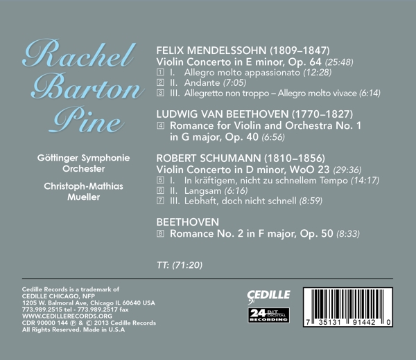 Beschreibung:Following on the heels of the Billboard chart-topping Violin Lullabies, Rachel Barton Pine joins forces with Germany's distinguished Gottinger Symphonie Orchester and it's acclaimed principal conductor, Christoph-Mathias Mueller to present Mendelssohn's celebrated violin concerto alongside the great, though lesser-known, concerto by Robert Schumann. The Chicago Tribune praised Pine's performance of Mendelssohn's concerto saying, 'The Mendelssohn is one of those fiddle war horses that every young soloist plays but few can play as beautifully as (Pine). Without resorting to any musical distortion, she invested the thrice-familiar phrase with a lyrical grace that seemed newly minted.', Runningtime: 00:00:00, Conductor: Christoph-Mathias Mueller, Engineer: Bill Maylone, Orchestra: Göttinger Symphonie Orchester, Producer: Steve Epstein, Violin: Rachel Barton Pine, Composed By: Felix Mendelssohn-Bartholdy, Composed By: Ludwig van Beethoven, Composed By: Robert Schumann, Composed By: Ludwig van Beethoven, Labelcode CED144.2 (CDR 90000 144), Phonographic Copyright (p) Cedille Records, Copyright (c) Cedille Records, Recorded At Stadthalle Göttingen