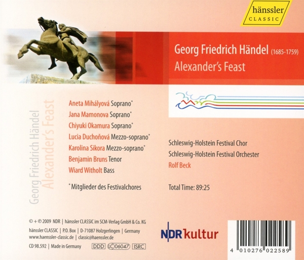 Disc 02 01. "Accompagnato und Chor: Lass t?nen deiner Leier Klang" 02. "Arie: Nimm Rach'! Timotheus ruft" 03. "Accompagnato: Rache schuldest du" 04. "Arie: Der Beifall der Krieger t?nt wild entflammt" 05. "Arie und Chor: Thais geht voran" 06. "Accompagnato und Chor: Vor langer Zeit" 07. "Rezitativ: Stimmt an den Sang im Freudenschall" 08. "Duett: Lasst t?nen hell den Lobgesang" 09. "Rezitativ: Leg ab, Timotheus, deinen Kranz!" 10. "Soli und Chor: Leg ab, Timotheus, deinen Kranz"