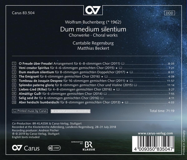 01. "O Freude über Freude" 02. "Veni creator Spiritus" 03. "Dum medium silentium" 04. "The Emigrant" 05. "Tombeau de Josquin Desprez (O mors inevitabilis)" 06. "Splendor paterne glorie" 07. "Liebes-Lied" 08. "Almáttigr Gud / Almighty God" 09. "Selig seid ihr" 10. "Aber heidschi bumbeidschi"
