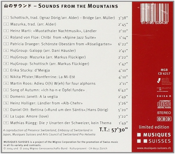01. D?rig, Ignaz "Schottisch / Bridge" 02. Alder "Mazurka" 03. Marti, Heinz "Muotathaler Nachtmusik" 04. Flüe, Roland Von "Chilbi (from "Alpine Jazz Suite")" 05. Draeger, Patricia "Sch?nste Obest?rn (from "R?seligarten")" 06. HujGroup "Galopp" 07. HujGroup "Mazurka" 08. HujGroup "Schottisch" 09. Stucky, Erika "D'Meigja" 10. Montferrine / Pfister, Nikkita "La mi-?t?" 11. Roos, Martin "Adieu O(h) W (eh) for four alphorns" 12. Song Of Autumn "Ich ha-n-e ?pfel funde" 13. Janett, Domenic "A la veglia" 14. Holliger, Heinz "L?ndler ("Alb-Cher")" 15. Ott, Daniel "Bettina ("Rund um den S?ntis")" 16. La Lupa "Amore (Love)" 17. Rüegg, Mathias "Die 7 Unarten der Schweizer, kein Thema"