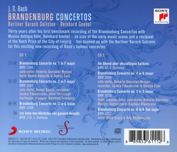 Beschreibung:Thirty years after his first reference recording of the Brandenburg Concertos (with the Musica Antiqua Köln), conductor Reinhard Goebel, the "early music icon" and winner of the Leipzig Bach Medal, is presenting an exciting new reference recording of Bach's celebrated masterpiece. For this project he has joined forces with the Berlin Barock Solisten, an ensemble formed in 1995 from members of the Berlin Philharmonic and leading figures in Berlin's early music scene with the goal of playing 17th- and 18th-century music at the highest artistic level on modern or modernized period instruments. Maestro Goebel and the Berlin Barock Solisten perform the Brandenburgs not only with consummate technique but with thrilling verve, supreme sensitivity and a wealth of dynamic contrasts. Goebel has also incorporated the latest findings of musical scholarship in his recording, for example regarding the choice of instruments. Rounding off the recording are the Sinfonias from the Cantatas Ich liebe den Höchsten von ganzem Gemüte (BWV 174) and Am Abend aber desselbigen Sabbats (BWV 42), both of which relate musically to the Brandenburg Concertos., Runningtime: 00:00:00, : , Horn: Andrej ?ust, Horn: Radek Baborák, Violin: Roberto González-Monjas, Oboe: Christoph Hartmann (2), Recorder: Saskia Fikentscher, Trumpet: Reinhold Friedrich, Violin: Daniel Gaede, Recorder: Kerstin Fahr, Recorder: Saskia Fikentscher, Violin: Roberto González-Monjas, Flute: Jacques Zoon, Harpsichord: Raphael Alpermann, Violin: Roberto González-Monjas, Viola: Máté Szücs, Viola: Nils Mönkemeyer, Labelcode SYNX88985361112.2 (88985361112, 88985361112)