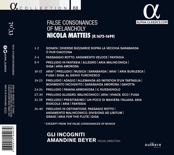 Beschreibung:After the success of the Red, Yellow, Blue and Pink collections (a total of 56 reissues), which brought the pearls from the Baroque catalogues of the house labels back into the spotlight, here are fourteen new titles offering a chance to rediscover more Baroque treasures and rarities. Like the last series, this fifth installment also opens up to the Classical (Mozart) or Renaissance (Dufay) repertories - recordings that are an integral part of Alpha's identity and history. This series' reissues are performed by the finest musicians in the field; most of these recordings received one or more awards on their first release. The albums come with proper booklets, including notes in three languages (French, English, German). Photographers from many different backgrounds illustrate the covers of the series with their works: this time the main theme is the color white. The present album features Nicola Matteis's Fanse Consonances of Melancholy performed by Amandine Beyer and Gli Incogniti., Labelcode ALLP497.2