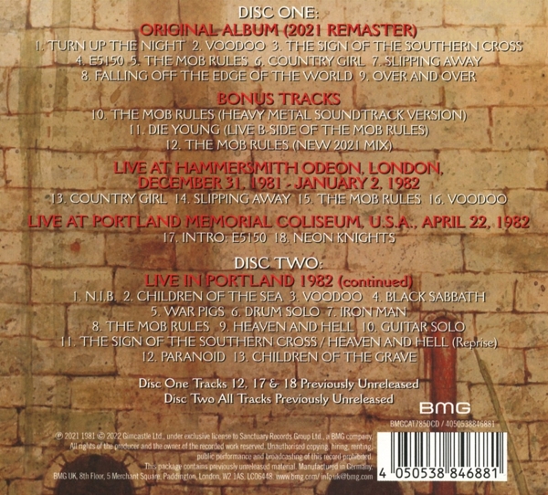 Disc 01 01. "Turn up the night (2021 Remaster)" 02. "Voodoo (2021 Remaster)" 03. "The sign of the Southern cross (2021 Remaster)" 04. "E5150 (2021 Remaster)" 05. "The mob rules (2021 Remaster)" 06. "Country girl (2021 Remaster)" 07. "Slipping away (2021 Remaster)" 08. "Falling off the edge of the world (2021 Remaster)" 09. "Over and over (2021 Remaster)" 10. "The mob rules (Heavy Metal Soundtrack Version)" 11. "Die young (Live)" 12. "The mob rules (New 2021 Mix)" 13. "Country girl (Live At Hammersmith Odeon, London)" 14. "Slipping away (Live At Hammersmith Odeon, London)" 15. "The mob rules (Live At Hammersmith Odeon, London)" 16. "Voodoo (Live At Hammersmith Odeon, London)" 17. "Intro: E5150 (Live At Portland Memorial Coliseum, U.S.A.)" 18. "Neon knights (Live At Portland Memorial Coliseum, U.S.A.)"