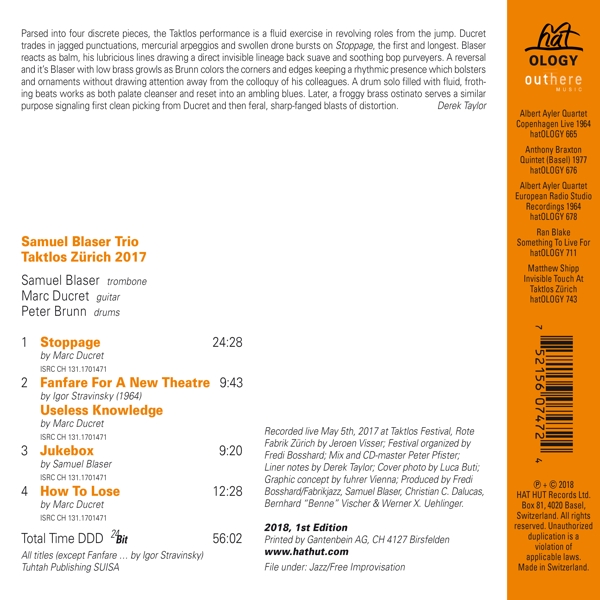 Beschreibung:Runningtime: 00:00:00, Design Concept [Graphic Concept]: fuhrer vienna, Drums: Peter Bruun, Ensemble: Samuel Blaser Trio, Guitar: Marc Ducret, Liner Notes: Derek Taylor (12), Mixed By, Mastered By [CD-master]: Peter Pfister, Photography By [Cover Photo By]: Luca Buti, Producer: Bernhard Vischer, Producer: Christian Dalucas, Producer: Fredi Bosshard, Producer: Samuel Blaser, Producer: Werner X. Uehlinger, Recorded By: Jeroen Visser, Trombone: Samuel Blaser, Composed By: Marc Ducret, Composed By: Igor Stravinsky, Composed By: Marc Ducret, Composed By: Samuel Blaser, Composed By: Marc Ducret, Labelcode HAHT747.2 (hatOLOGY 747), Manufactured By www.adon.ch, Phonographic Copyright (p) Hat Hut Records Ltd., Copyright (c) Hat Hut Records Ltd., Printed By Gantenbein AG, Published By Tuhtah Publishing, Recorded At Rote Fabrik