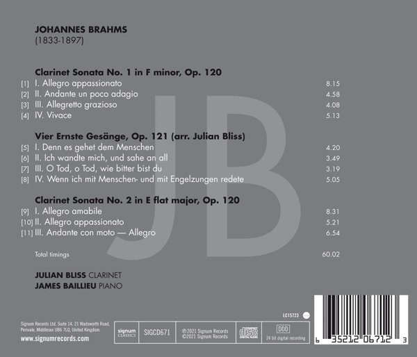 Beschreibung:Julian Bliss and James Baillieu present a recording Johannes Brahms' Clarinet sonatas, Op. 120 and an arrangement of his 4 Ernste Gesänge, Op.121 arranged by Bliss. These late works were inspired by the great clarinetist Richard Muhlfeld, principal clarinet of the Meiningen Court Orchestra, without whom we would not have had this clarinet repertoire. Julian Bliss is one of the world's finest clarinetists, excelling as a concerto soloist, chamber musician, jazz artist, masterclass leader and tireless musical explorer. He has inspired a generation of young players as creator of his Conn-Selmer range of affordable clarinets, and introduced a substantial new audience to his instrument. Julian started playing the clarinet aged four, going on to study at the University of Indiana and in Germany under Sabine Meyer, turning professional aged twelve. Described by The Daily Telegraph as 'in a class of his own' James Baillieu is one of the leading song and chamber music pianists of his generation. He has given solo and chamber recitals throughout the world and collaborates with a wide range of world-class singers and instrumentalists. As a soloist, he has appeared with the Ulster Orchestra, English Chamber Orchestra, and the Wiener Kammersymphonie., Runningtime: 00:00:00, Labelcode SGUK671.2
