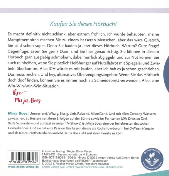 01. "Mett, Sie kennenzulernen" 02. "Klein-Mirja am Fuße des Mount Sauerkraut" 03. "Das Schokoparadies im Schrank" 04. "Auf der Nutellacouch mit Ei und Zwiebel" 05. "Geschmacksknospenbungeejumping oder kurz: Oink! Oink!" 06. "Vive la p?t?! Es lebe die ausl?ndische Leberwurst" 07. "Serranoschinkennuckeln und eine bittere Erkenntnis" 08. "Hier super! - Urlaub im Clubresort Morbus Mama" 09. "Worte für die vielleicht dr?lftsch?nste Sache der Welt: Das Kotzen" 10. "Die "Top Seven" meiner sch?nsten Kotzgeschichten" 11. "Die hohe Kunst der Etikette - nach Dr. knab. lutsch. pell. Mirja Boes" 12. "Oma Erna" 13. "Schieberschaberl?ffelding und ein Wiedersehen mit Fipsi" 14. "Di?ten: 1. Versuch" 15. "Di?ten: 2. Versuch!" 16. "Di?ten: 3. Versuch! - Zahnpelzige Fleischfresserzombies gegen puddingkackende Gurkendiebe" 17. "Meine Top Ten Lieblingsgerichte - And the dinner is...!" 18. "Nimm das weg! Nimm das weg! - Die Top Ten der ekligsten Essenssachen" 19. "Lebensrettende-Lebensmittel-Sofortmaßnahmen oder kurz: Das Sicherheitsessen" 20. "Küchenhelferhaushaltsger?teauflistung" 21. "Ausführliche Küchenhelferhaushaltsger?teauflistung" 22. "Brücken aus Mett" 23. "Papa" 24. "Bitte nicht schimpfen! Sachen, die nach nix schmecken" 25. "Die Weizenmehlymphonie - Meine Ode an das Toastbrot" 26. "Bremsklotzkühltaschenrastst?ttenromantik" 27. "Villa Vue" 28. "Beschwerde-Tourette, nur andersrum" 29. "Mirjas Geheimrezepte (die nun nicht mehr geheim sind, weil ich sie ja vorlese und Sie diese nun h?ren k?nnen)" 30. "Schlusswort" 31. "Rezensionen oder Stimmen aus dem Volk"