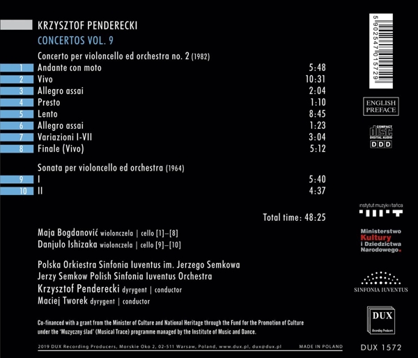 | Beschreibung: | Krzysztof Penderecki's Concerto for Cello and Orchestra No. 2 (1982) was commissioned by the Berlin Philharmonic and dedicated to that orchestra and Mstislav Rostropovich. It belongs to the compose-r's most original and developed concertos, one in which Penderecki's quasi-romantic ideas are blended with highly dissonant, sonoristic episodes that significantly enrich the work's highly complex architecture. Even though the composition falls into eight distinct segments, Penderecki manages to achieve what seems to be impossible given the intricacies of the score - to create the impression of narrative cohesion. The work's formal design is based on repetitions and dissonances. A strongly chromaticised motif, which reappears in brief episodes during the piece in various configurations, is the starting point for the formal development. As the work unfolds, it is almost impossible to pinpoint precisely the factor which determines it's narrative development, in view of the numerous aesthetic collages and the incessant changes in expression and harmony. Moreover, Penderecki unexpectedly embarks on ingenious experiments aimed at the maximum use of the orchestra's potential. Penderecki's Sonata for cello and orchestra is an example of the composer's strictly avant garde and sonoristic thinking of the mid-1960s. Written in 1964, the work had it's world premiere in the same year at the Donaueschinger Musiktage, with Siegfried Palm, a cellist who specialized in contemporary music, as the soloist. The work consists of two parts which have much common in terms of expression but are texturally diverse. The overall mood is one of anxiety and inevitability. The smoothly-flowing, quiet narration of the first movement is based on long motifs in the strings. In the second movement, the mosaic of ideas undergoes a far-reaching change, with the percussion group joining the soloist in the foreground as a counterpoint to the cello., Runningtime: 00:00:00, Labelcode DUX1572.2 |