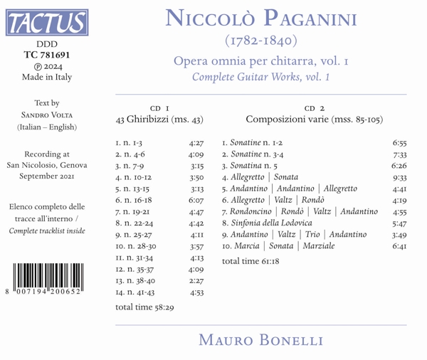 Beschreibung:The importance of the guitar is evident throughout the span of Paganini's activity as a composer, and it is possible that as a boy, before he began to practice on the violin and the "chittara francese", he received from his father his first musical grounding on a "mandolino genovese", an instrument that had six courses or six single strings, with the same tuning relationship as that of the guitar. The Catalogue's chronological list ranges from 1795, with Carmagnola con variazioni ms. 1, to 1835, with Variazioni sul Barucaba, an entire cycle of compositions that features the constant presence of a guitar in combination with string instruments. This context contains the compositions for solo guitar, which are divided into three groups: Ghiribizzi, Sonate, and Compositions of various types, including some Sonatine. The recording dedicated to Paganini's opera omnia for guitar is divided in two double CDs volumes, the first volume includes the 43 Ghiribizzi and other various compositions (sonatas, sonatinas and free forms). Mauro Bonelli, for the realisation of this work, used a period guitar with catgut strings, tuned to 415 Hz: nineteenth-century Austrian guitar without a label; the fact that it's fretboard can be tilted by means of a peg connects it with the best Legnani-Stauffer tradition., Runningtime: 00:00:00, Labelcode TCS781691.2