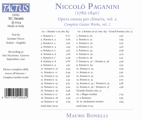 Beschreibung:The importance of the guitar is evident throughout the span of Paganini's activity as a composer, and it is possible that as a boy, before he began to practice on the violin and the "chittara francese", he received from his father his first musical grounding on a "mandolino genovese", an instrument that had six courses or six single strings, with the same tuning relationship as that of the guitar. The Catalogue's chronological list ranges from 1795, with Carmagnola con variazioni ms. 1, to 1835, with Variazioni sul Barucabà, an entire cycle of compositions that features the constant presence of a guitar in combination with string instruments. This context contains the compositions for solo guitar, which are divided into three groups: Ghiribizzi, Sonate, and Compositions of various types, including some Sonatine. The recording dedicated to Paganini's opera omnia for guitar is divided in two double CDs volumes, the first volume includes the 43 Ghiribizzi and other various compositions (sonatas, sonatinas and free forms). Mauro Bonelli, for the realisation of this work, used a period guitar with catgut strings, tuned to 415 Hz: nineteenth-century Austrian guitar without a label; the fact that it's fretboard can be tilted by means of a peg connects it with the best Legnani-Stauffer tradition., Runningtime: 00:00:00, Labelcode TCS781692.2