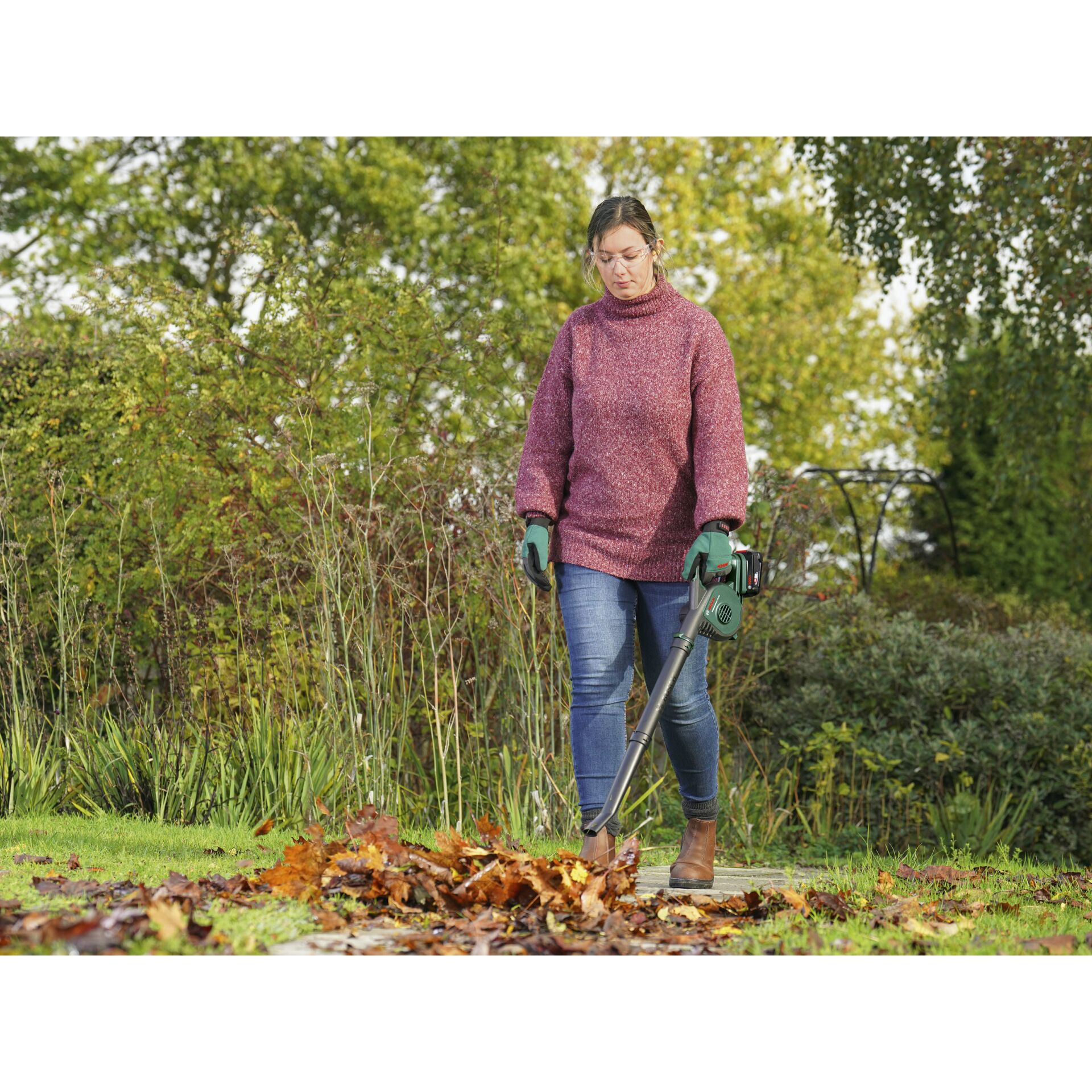 | Typ(en) | | Typ(en) | Laubbläser | | Technische Daten/Details | | Luftgeschwindigkeit (km/h) | 185 - 245 | | Luftgeschwindigkeit (km/h) | 211 - 330 | | Luftgeschwindigkeit regelbar | Ja | | Stromversorgung | | Betriebs-Art | Akku | | Batterietyp/Akkutyp | Lithium-Ionen | | Akku(s) im Lieferumfang | 1x | | Akkuspannung (V) | 18 | | Akku-Kapazität (Ah) | 2,5 | | Betriebsdauer (Min.) | 18 | | Allgemeine Daten | | Farbe | grün / schwarz | | Gewicht in kg | 1,3 | | Gewicht in kg | <1,5 |